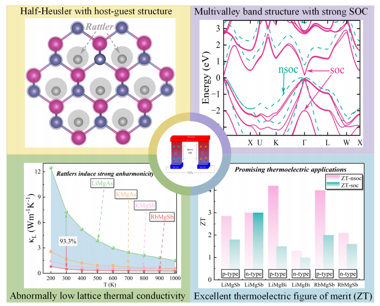 文章题目:Unconventional lattice thermal transport and high thermoelectric performance in eight alkali-metal half-Heusler compounds AMgX (A = Li, Na, K, Rb; X = As, Sb, Bi)